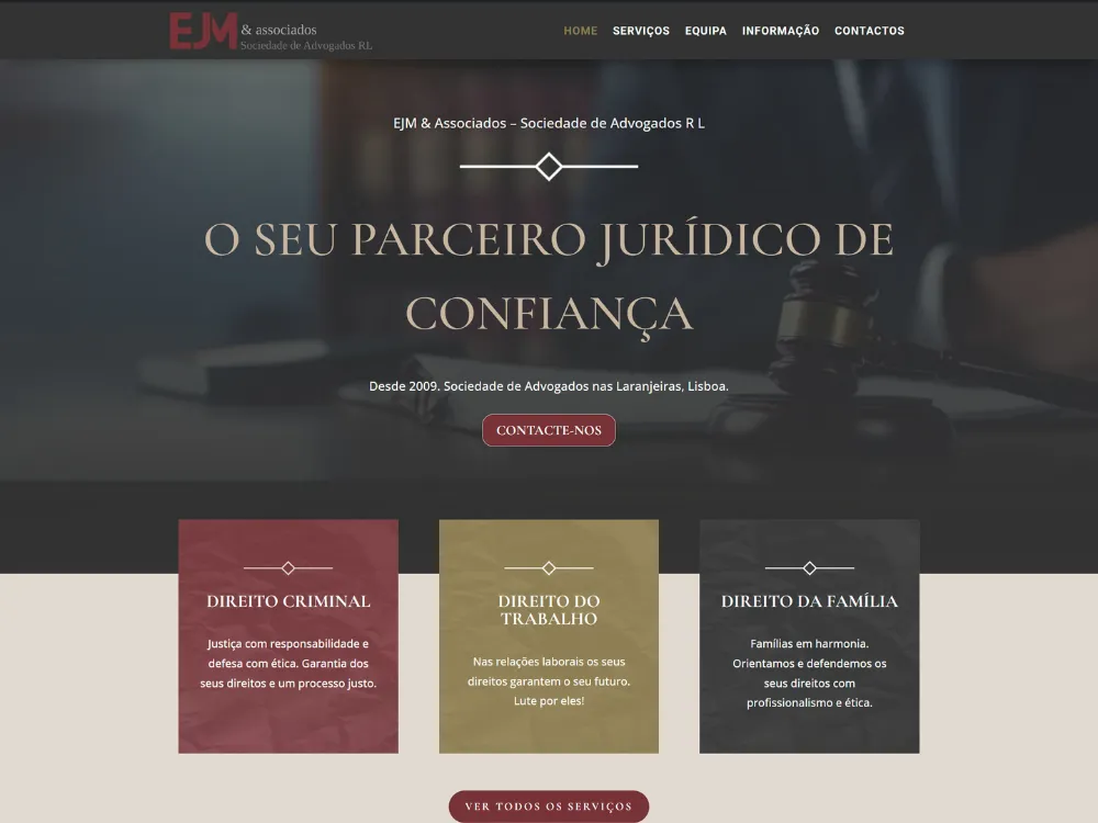 Redesign completo com foco em SEO. O escritório passou a ocupar o 1º lugar no Google para as principais pesquisas da área. Conformidade RGPD implementado.